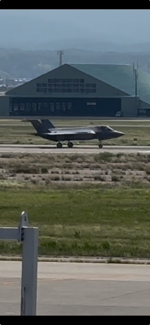 見渡すと戦闘機の格納庫がかなり遠方に見えました。暫く見ていると戦闘機らしきものが格納庫から3機出てきました。あれ?まさしく今回期待していた「F35A」でした。ラッキーそのもの。周りの見物客は一斉にスマホや一眼レフで撮影。私も必死に…スマホでしたし遠方の為拡大したら画像が荒い!